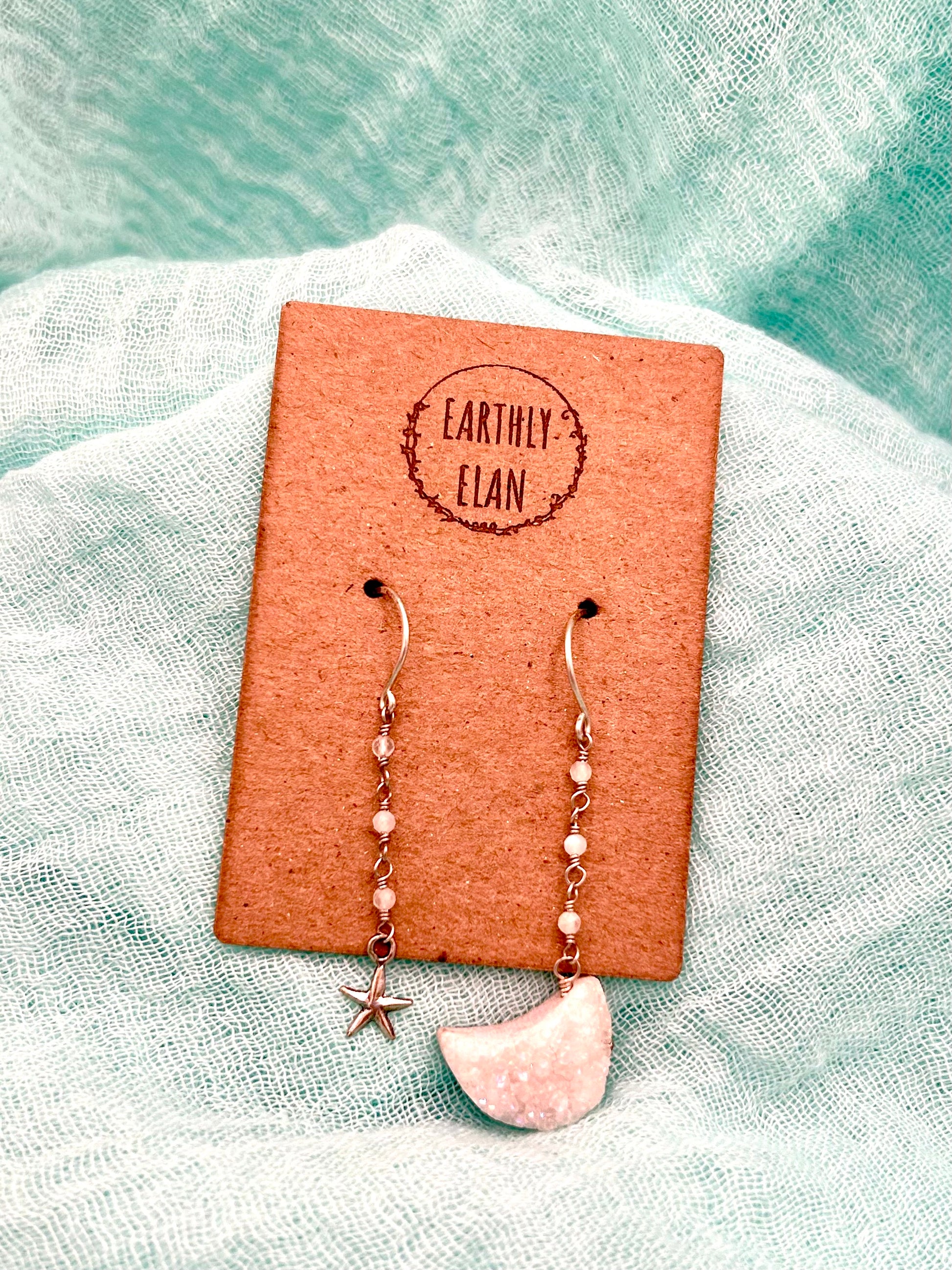 Titanium aura white druzy crescent moon and a sterling silver star, accented with tiny moonstones. Individually wire wrapped by hand on recycled sterling silver. Measure approximately 2 1/4”
