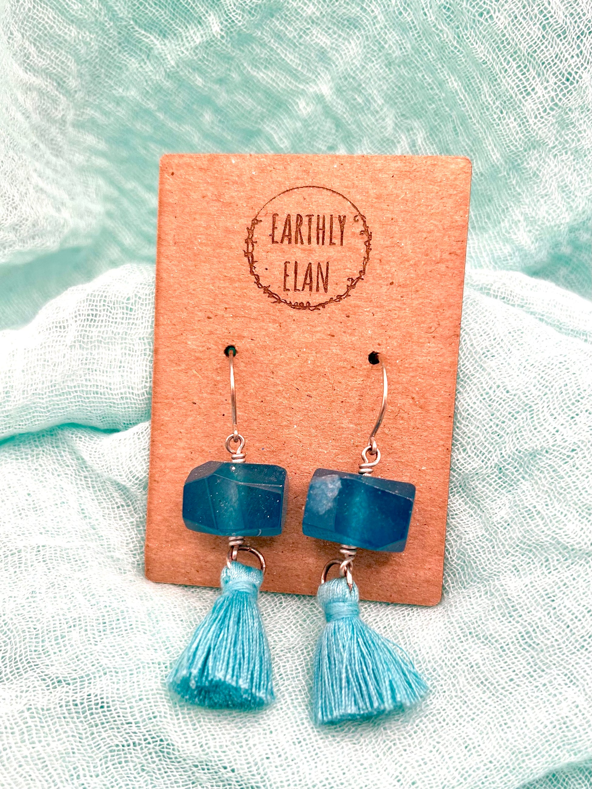 Ocean turquoise chunky Malaysia jade tassel earrings individually wrapped by hand on recycled sterling silver wire. Handcrafted French hook sterling silver ear wires. Drop measures approximately 1 3/4”