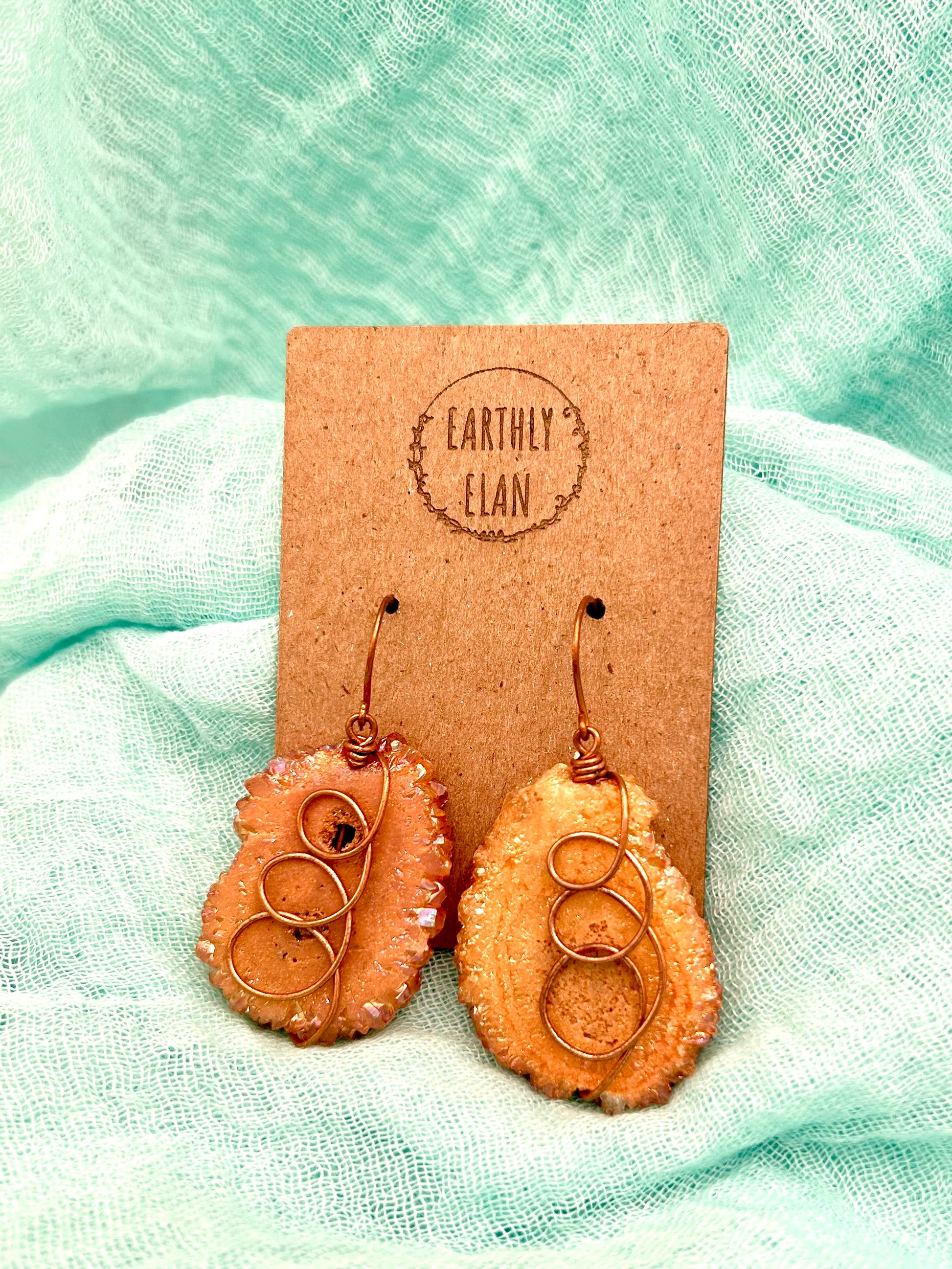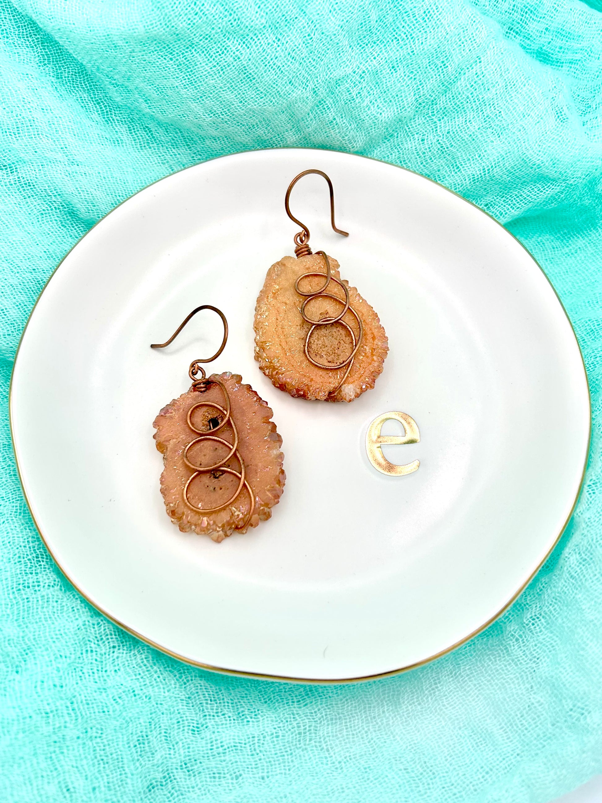 Bright and sparkly citrus geode slices with a titanium aura finish, accented with cheery copper swirls. Individually wire wrapped by hand on copper wire. Drop measures approximately 1 1/2”. Please allow for slight variation in natural stone.